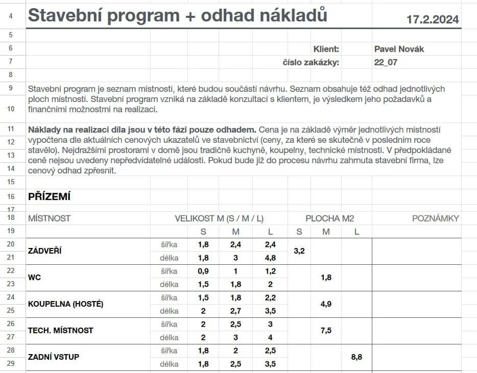 Podklad, který vám pomůže v počátečních fázích návrhu stanovit velikost domu na základě požadovaného stavebního programu.